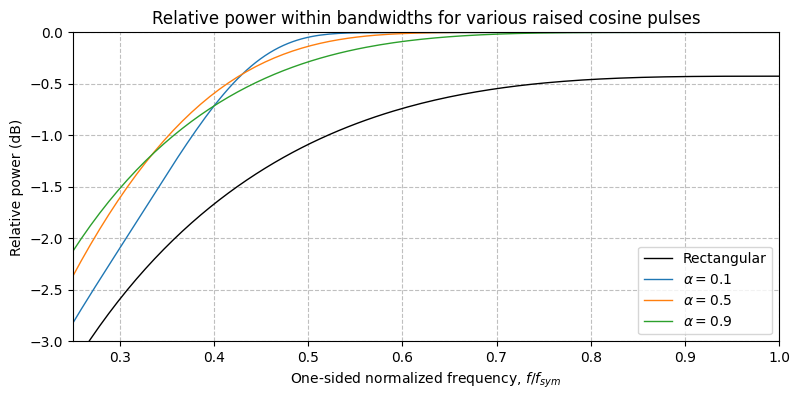 Notice the raised cosine pulse with excess bandwidth \(\alpha = 0.1\) has a total bandwidth of nearly \(f_{sym}\). Compare this to \(\alpha = 0.9\), which has a null-to-null bandwidth of nearly \(2 f_{sym}\).